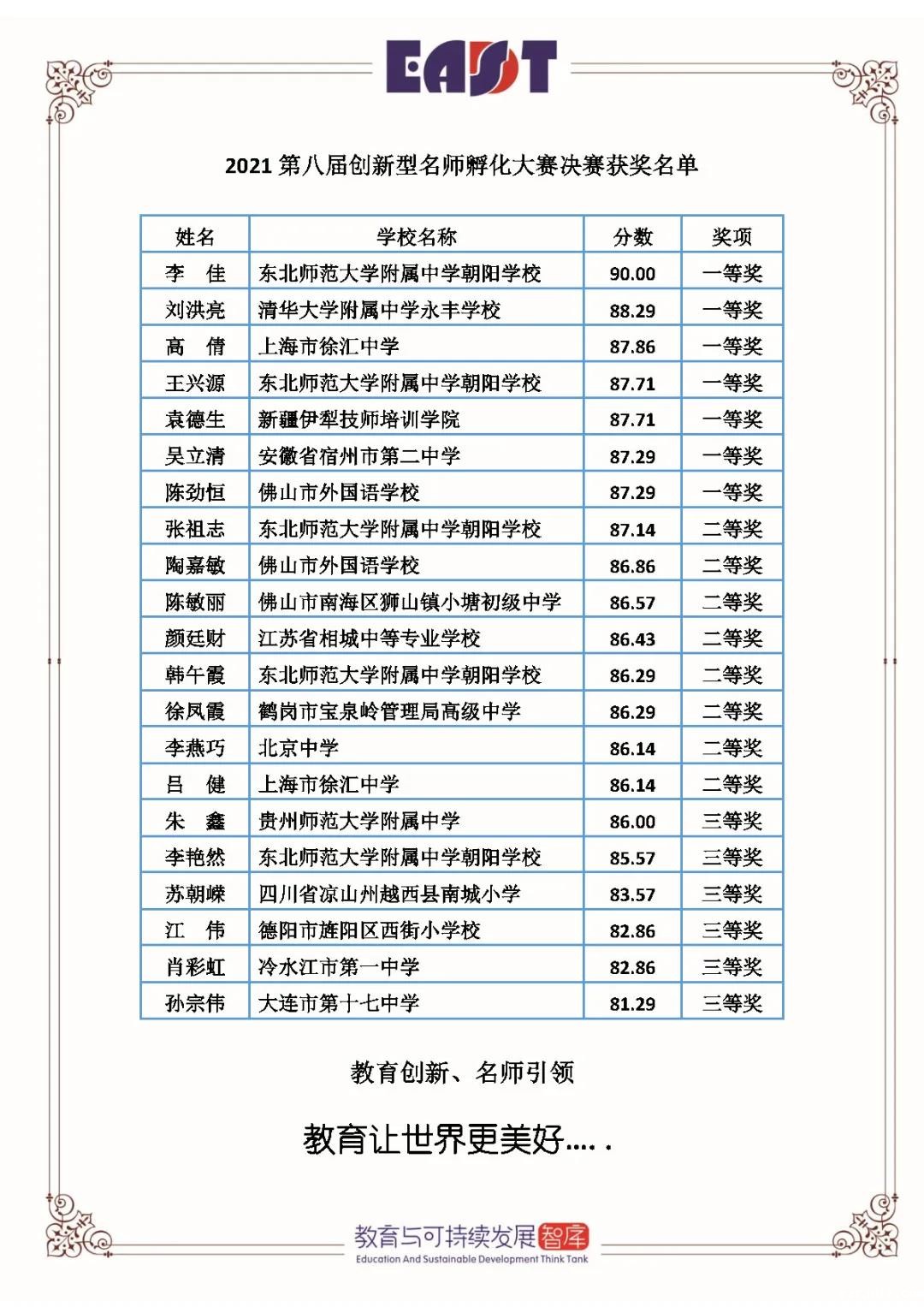 第八届创新型名师孵化大赛(IFT)决赛分别从教学技能、表达技能、思维技能、创新技能四个维度进行评价,经过专家评审最终来自东北师范大学附属中学朝阳学校李佳老师、清华大学附属中学永丰学校刘洪亮老师、上海市徐汇中学高倩老师、东北师范大学附属中学朝阳学校王兴源老师、新疆伊犁技师培训学院袁德生老师、安徽省宿州市第二中学吴立清老师、佛山市外国语学校陈劲恒老师荣获一等奖。