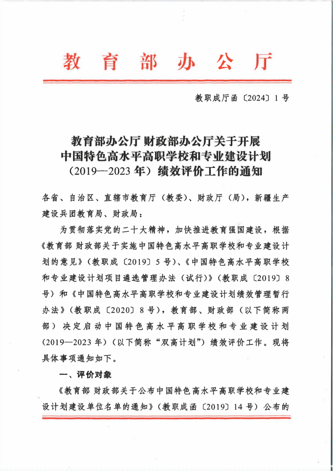 教育部 财政部关于开展中国特色高水平高职学校和专业建设计划(2019—2023年)绩效评价工作的通知